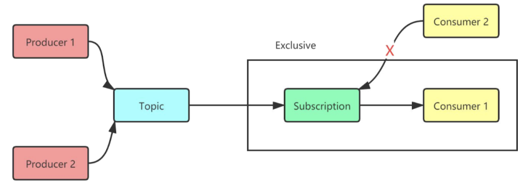不管有多少个 consumer 同时存在,只会有一个 consumer 是活跃的,也就是只有这一个 consumer 可以接收到这个 topic 的所有消息。这种模式就为 Pulsar 订阅模式中的独占订阅(Exclusive),这种模式跟 AMQP 中的排他队列比较吻合。