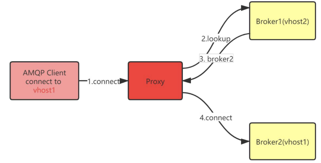 AoP Proxy 用于在客户端与 AMQP 服务连接时,帮助查找负责处理 Vhost 数据的 owner broker,并在客户端与 Vhost 的 owner broker 之间传输数据。下图说明了 AoP Proxy 的服务流程。