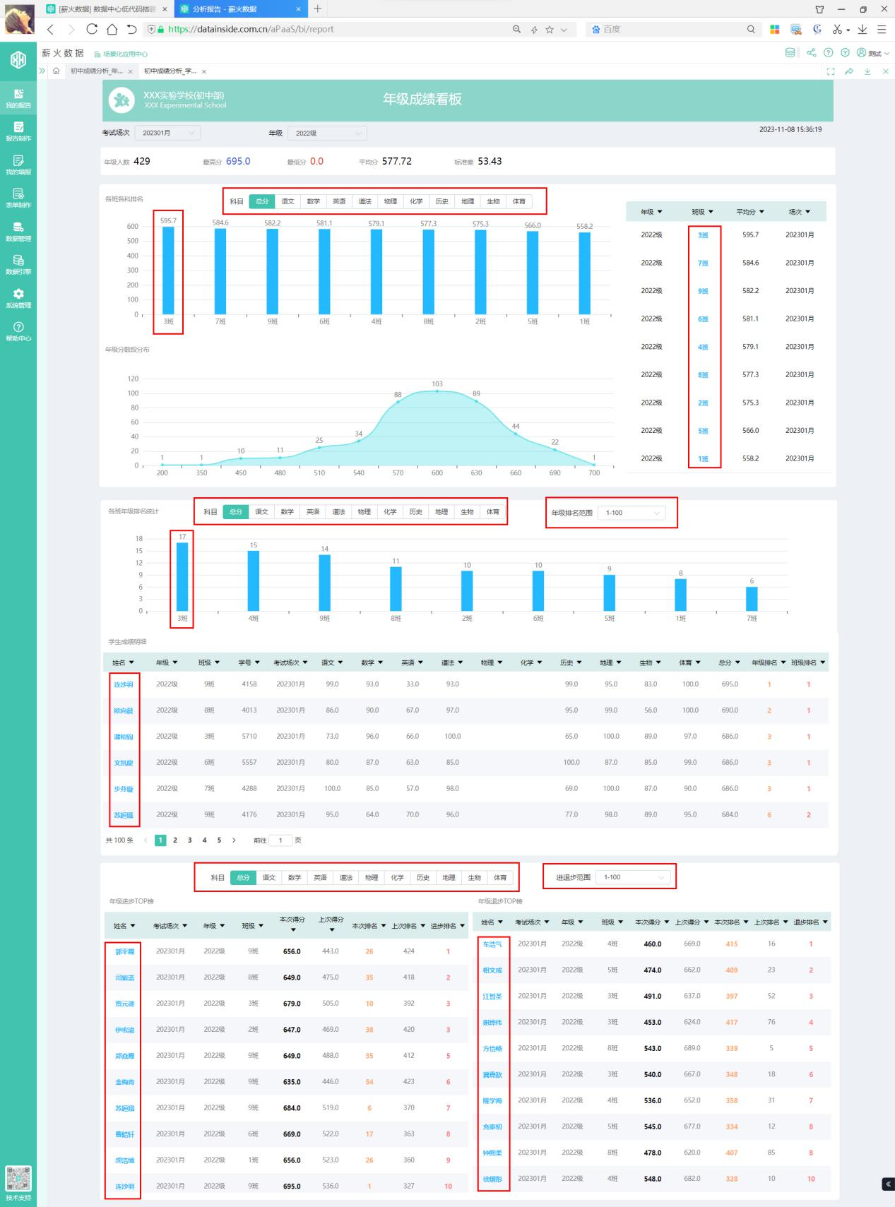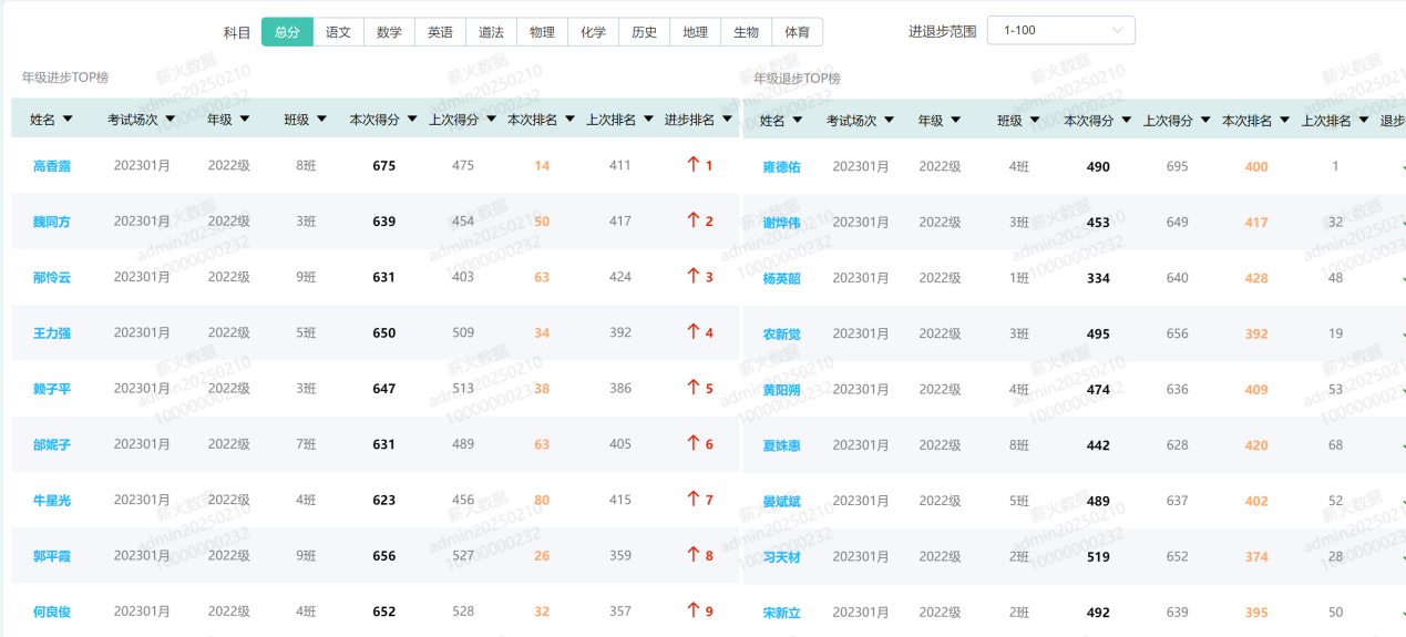 功能亮点:按科目筛选排名变化幅度(如进步/退步超50名),生成“进步榜”与“警示榜”。
