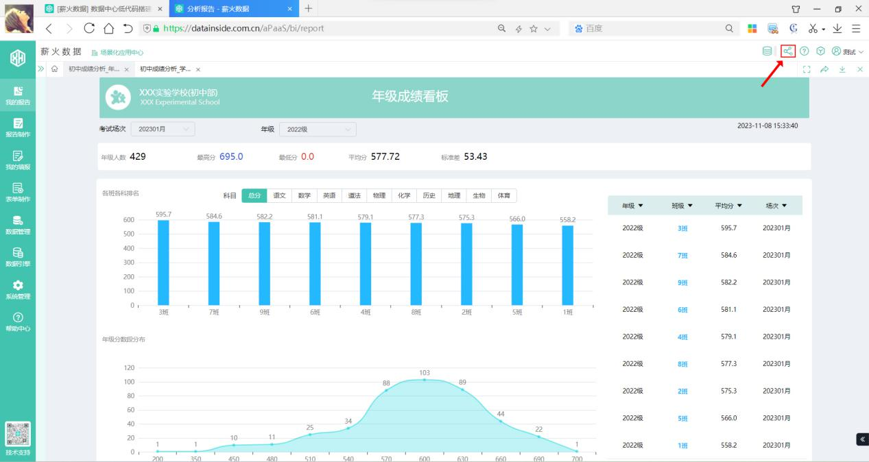 功能亮点:各班总分及单科平均分实时排名,支持点击班级名称跳转至班级专属看板。