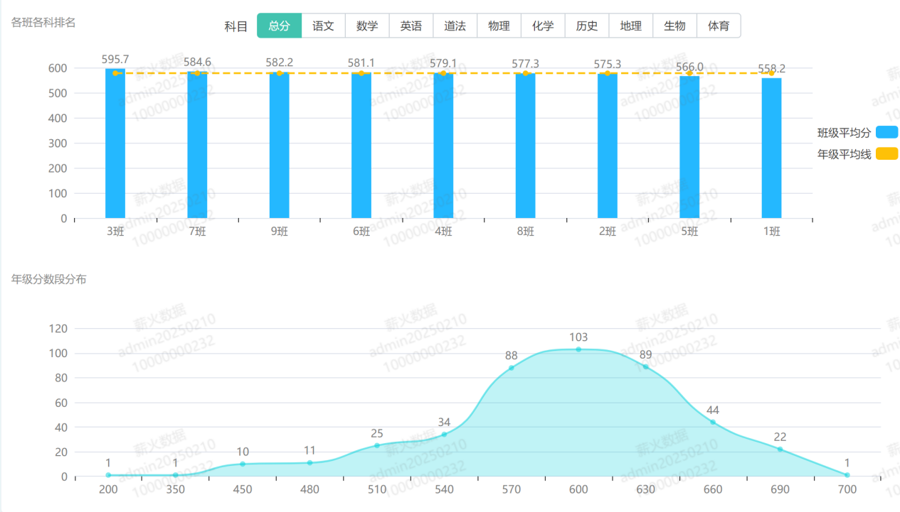 应用价值:横向对比班级间差异,快速定位优势学科与待提升科目。例如,某班数学平均分持续偏低,可针对性加强教研支持。