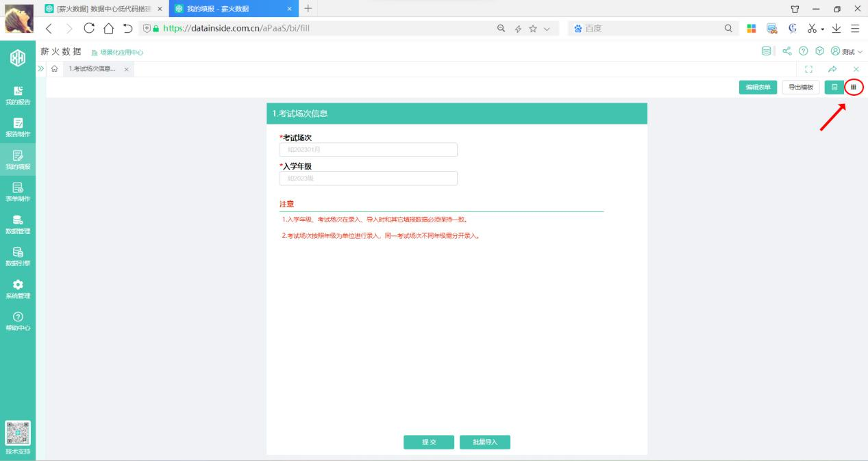 登录《薪火数据》账号后,进入“场景应用中心”,选择“初中考试成绩分析2.0”并点击“立即应用”,系统将自动完成部署。无需复杂配置,1分钟内即可进入数据管理界面,开启高效分析模式。