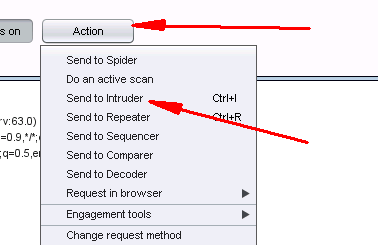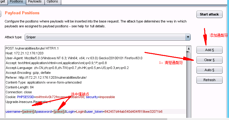 3、点击action,提交到将username和password中添加通配符,进行选中爆破点。