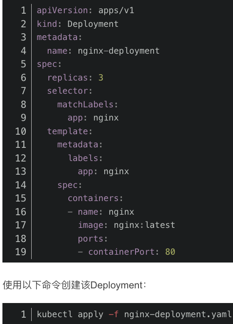 基于YAML文件创建:编写YAML文件后,使用kubectl apply -f <filename>.yaml命令创建。例如,kubectl apply -f my-deployment.yaml。