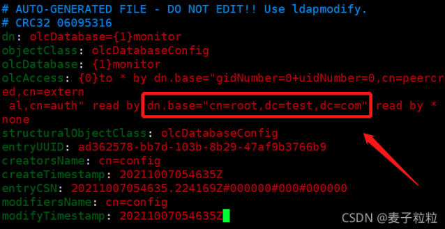 olcAccess: {0}to * by dn.base=”gidNumber=0+uidNumber=0,cn=peercred,cn=external,cn=auth” read by dn.base=”cn=root,dc=test,dc=com” read by * none