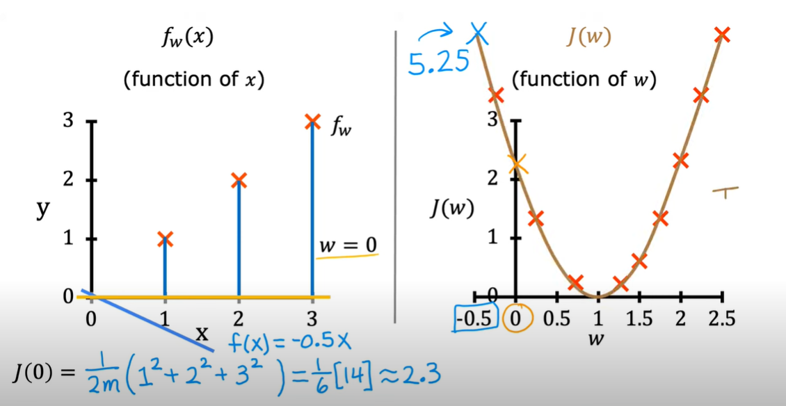 参数\(w\)(只有一个)不同时,代价函数\(J\)的变化: