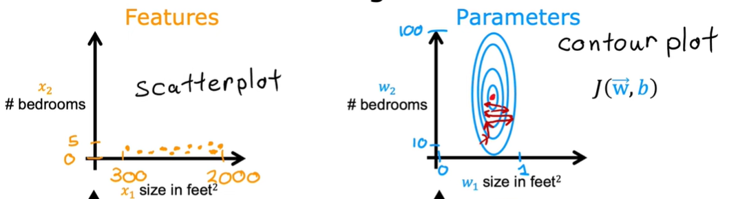 如果你想预测房价,现在有两个变量 x1 和 x2 来控制房子的价格。 x1 为房子的大小,范围在 0 到 2000,x2 为房子中卧室的数目,范围在 0 到 5,那么画出这个代价函数的轮廓图就是这个样子,一个扁扁的椭圆形。