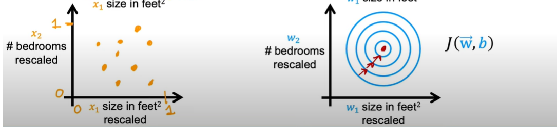 这里就要用到特征缩放(Feature Scaling)。将变量 x1 和 x2 都缩放到一个范围中,我们将他们都缩放到 -1 到 1 这个范围内。最简单的方法就是将 x1 除以 2000(因为他的范围就是 0-2000), x2 除以 5。
