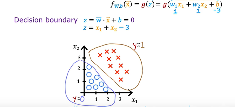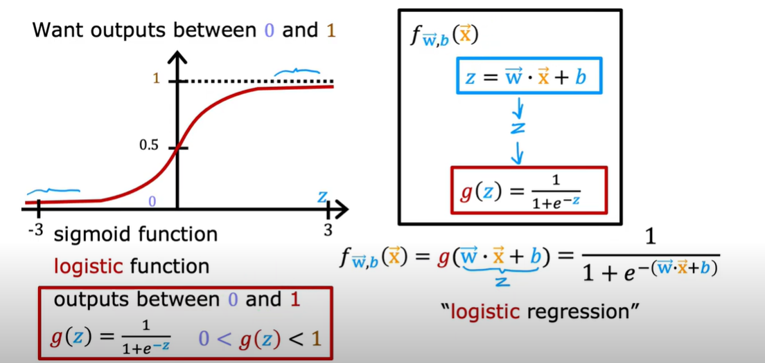\(f_{\vec{w},b}(\vec{x}) = g(\vec{w} \cdot \vec{x} + b) \ = \frac{1}{1 + e^{-(\vec{w} \cdot \vec{x} + b)}}\)