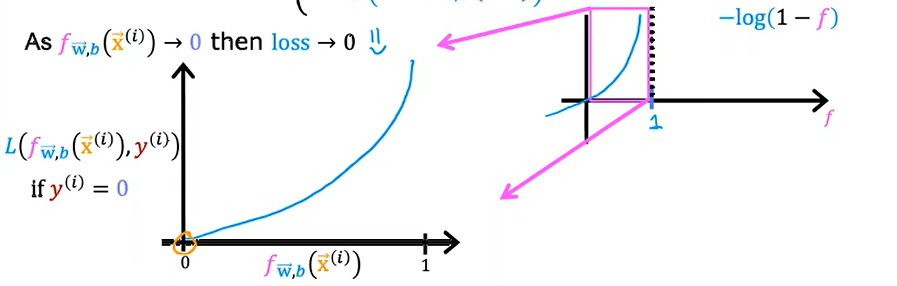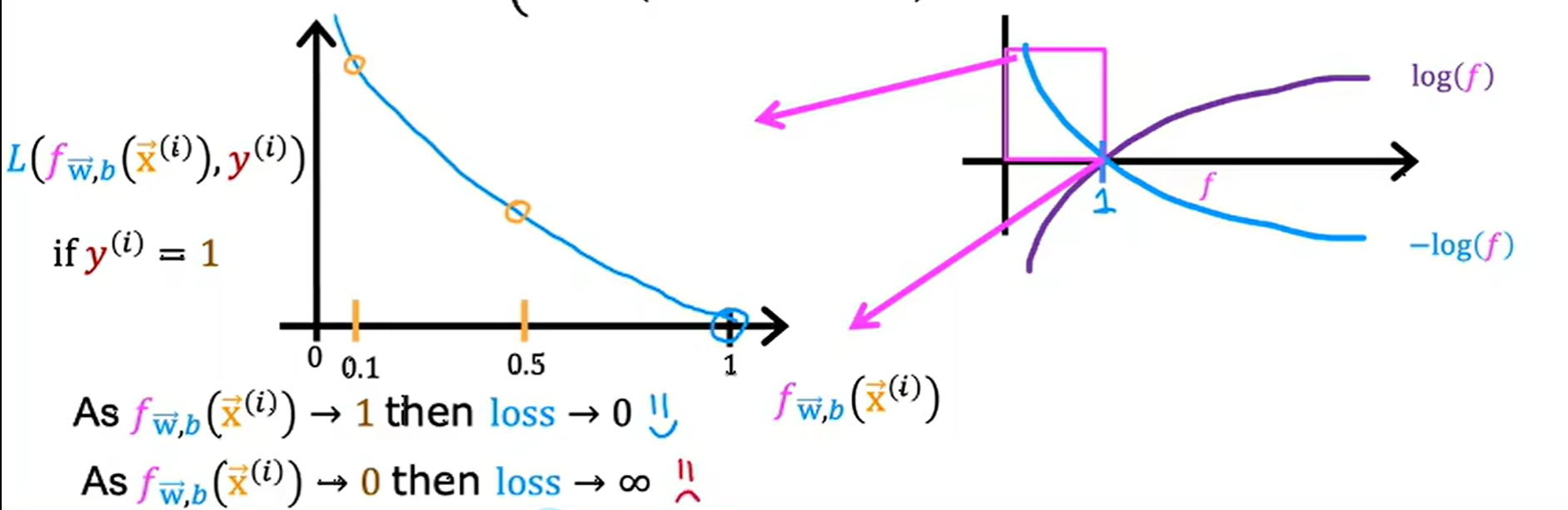 \(L(f_{\vec{w}, b}(\vec{x}^{(i)}), y^{(i)}) = \begin{cases} -\log(f_{\vec{w}, b}(\vec{x}^{(i)})) & \text{if } y^{(i)} = 1 \\ -\log(1 - f_{\vec{w}, b}(\vec{x}^{(i)})) & \text{if } y^{(i)} = 0 \end{cases}\)