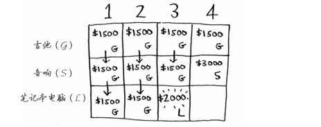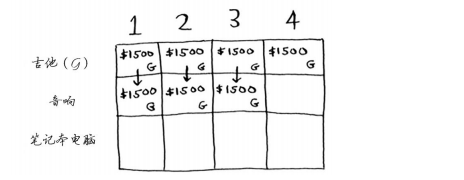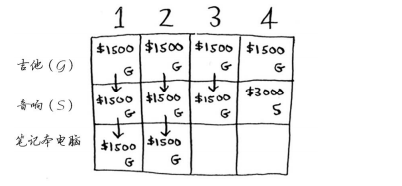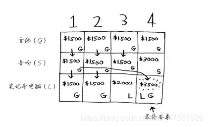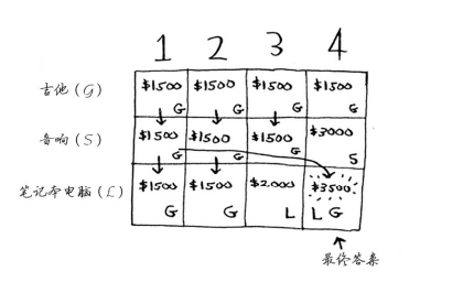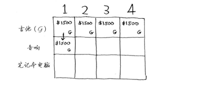 意味着你将尝试将吉他装入背包。在每个单元格,都需要做一个简单的决定:偷不偷吉他?别忘了,你要找出一个价值最高的商品集合。