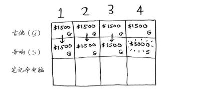 由于这些背包装不下音响,因此最大价值保持不变。背包容量为4磅呢?终于能够装下音响了!原来的最大价值为1500美元,但如果在背包中装入音响而不是吉他,价值将为3000美元!因此还是偷音响吧。
