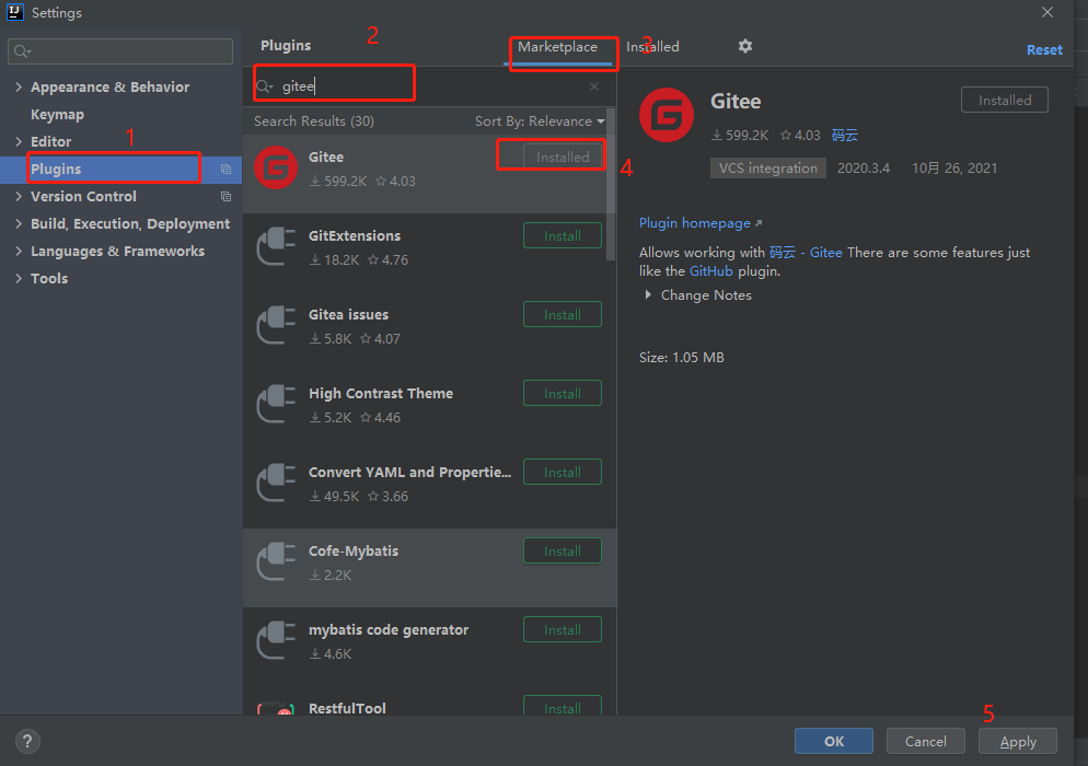 1.idea下载gitee插件:settings->Plugins