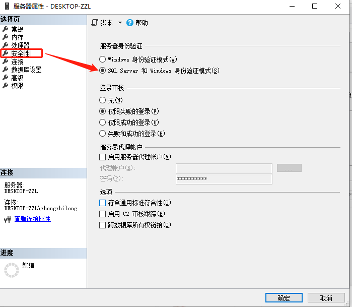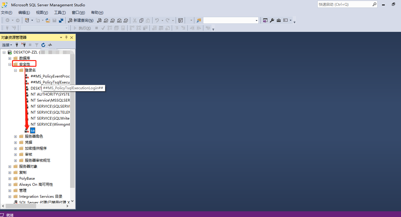 点击确定后,需要重新启动或者退出,重新用SQL Server Management Studio进入,以SQL Server身份验证登录