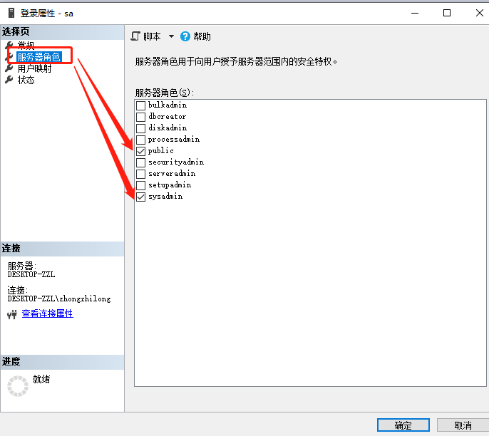 设置服务器角色:public和sysadmin