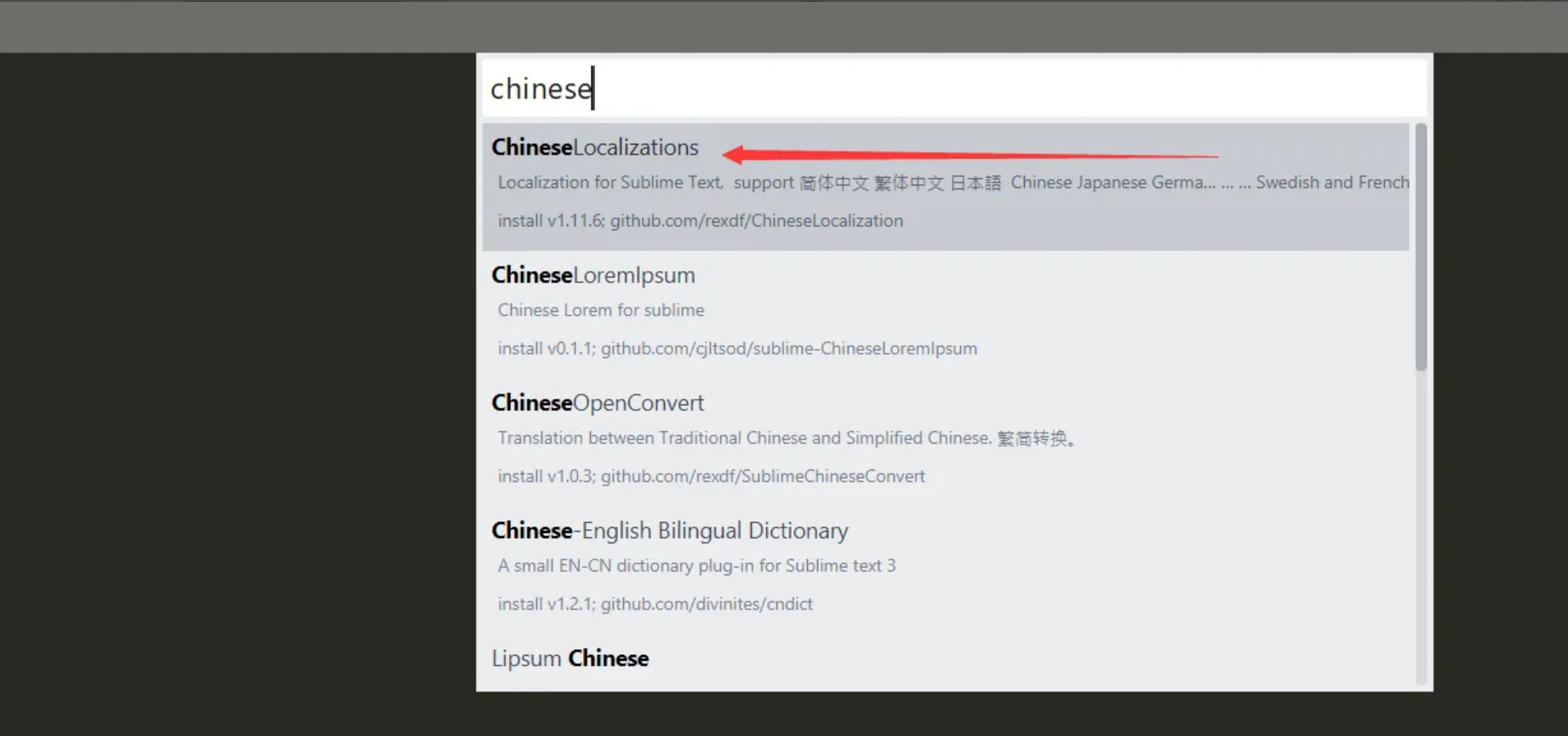 第四步:在白色输入框中输入ChineseLocalizations回车即可,此时就在安装ChineseLocalizations这个插件,该插件用于汉化软件