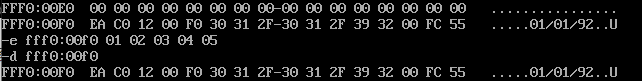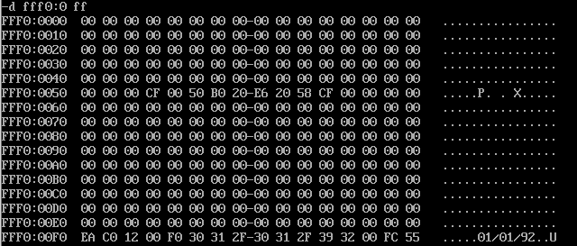 由下图可知,查看FFF00H-FFFFFH的内容后,发现最后一栏地址为FFF0:00F0的空间注释中显示的是日期,所以该地址存放的就是生产时期: