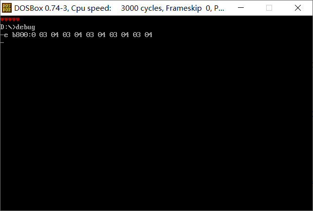 尝试将内存单元为b800:0010开始的内存空间连续三次修改为十六进制数据02 01,用d命令可以看到数据被成功修改,并且顶部输出三个绿色微笑表情: