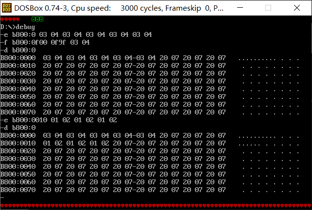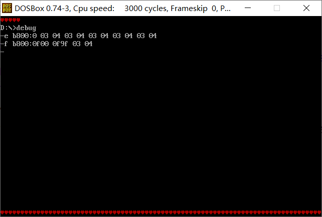 使用f命令,向内存单元批量填写数据。底部输出了一整排红心: