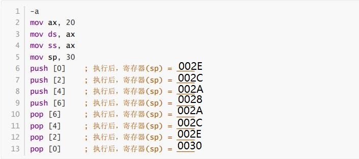 填空:单步执行,在执行push指令和pop指令时,观察并记录栈顶偏移地址的寄存器sp值的变化情况。