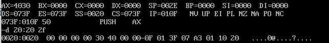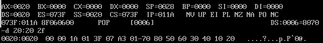 问题三:pop [0] 指令执行结束后,使用d命令d 20:0 7 查看此时数据空间内的数据是否有变化。可看出数据出栈后在数据空间中以正常顺序存放: