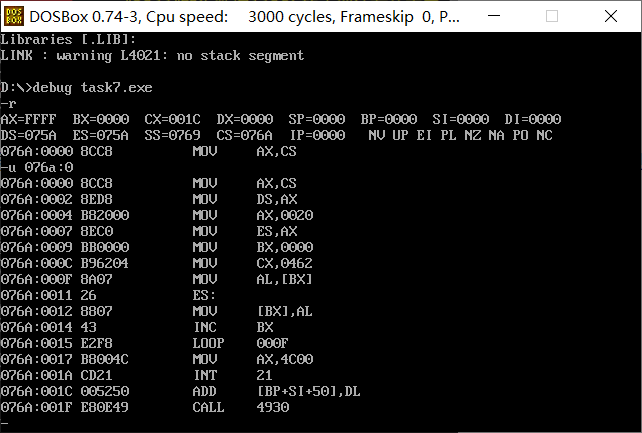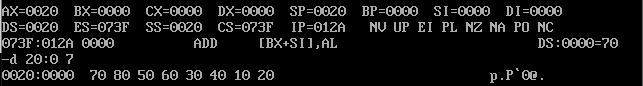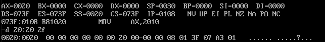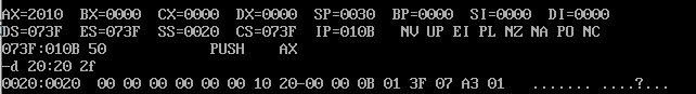 可看出栈中因为指令push ax而存放了ax中的数据,除此之外还存放了每次执行指令后cs、ip两个寄存器中的内容。因为cs和ss两个寄存器具有相同的地址。