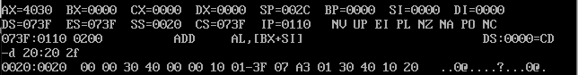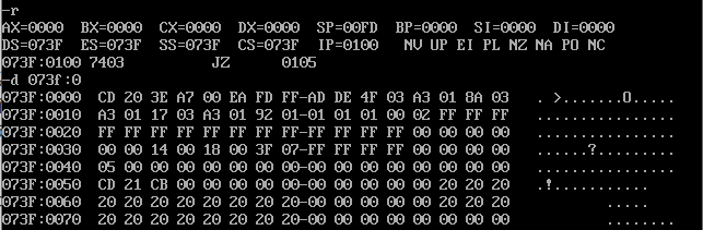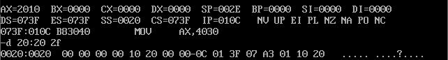 试图用e命令修改地址为FFF0:00F0的空间开头的连续五个单元的值,再用d命令查看,发现这些值并没有改变。因为ROM中的信息是由计算机制造商写入的,用户无法改写。