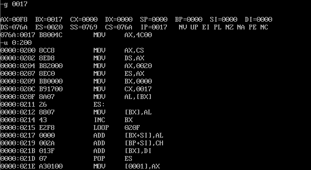 assume cs:code code segment mov ax,cs mov ds,ax mov ax,0020h mov es,ax mov bx,0 mov cx,0017h s: mov al,[bx] mov es:[bx],al inc bx loop s mov ax,4c00h int 21h code ends end
