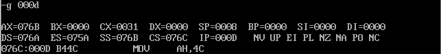 assume ds:data, cs:code, ss:stack data segment db 4 dup(0) data ends stack segment db 8 dup(0) stack ends code segment start: mov ax, data mov ds, ax mov ax, stack mov ss, ax mov sp, 8 mov ah, 4ch int 21h code ends end start
