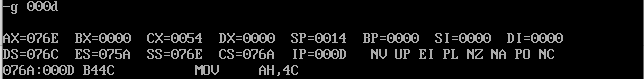① 在debug中将执行到line17结束、line19之前,记录此时:寄存器(DS) = _076A_, 寄存器(SS) = _076B_, 寄存器(CS) = _076C_