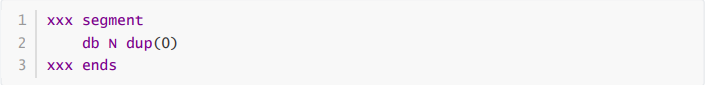 assume ds:data, cs:code, ss:stack code segment start: mov ax, data mov ds, ax mov ax, stack mov ss, ax mov sp, 20 mov ah, 4ch int 21h code ends data segment db 20 dup(0) data ends stack segment db 20 dup(0) stack ends end start
