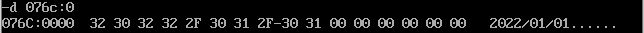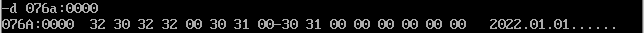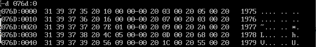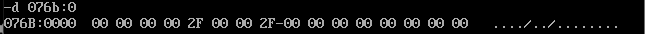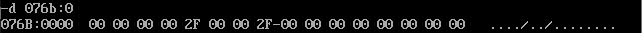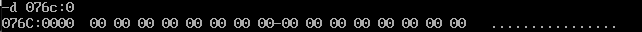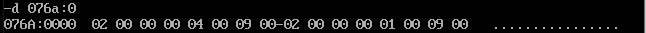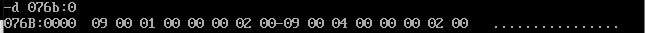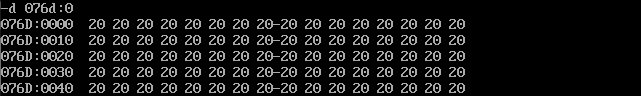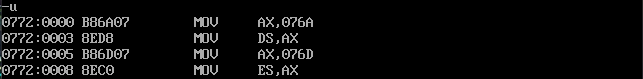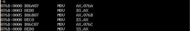 首先通过反汇编得知三个数据段的地址分别是076A,076B,076C,用d命令查看即可: