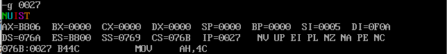 使用debug工具对程序进行调试,使用g命令一次性执行到程序返回前(即ine25执行之后、line27 执行之前)的截图: