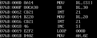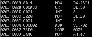assume cs:code, ds:data data segment x db 1, 9, 3 len1 equ $ - x y dw 1, 9, 3 len2 equ $ - y data ends code segment start: mov ax, data mov ds, ax mov si, offset x mov cx, len1 mov ah, 2 s1:mov dl, [si] or dl, 30h int 21h mov dl, ' ' int 21h inc si loop s1 mov ah, 2 mov dl, 0ah int 21h mov si, offset y mov cx, len2/2 mov ah, 2 s2:mov dx, [si] or dl, 30h int 21h mov dl, ' ' int 21h add si, 2 loop s2 mov ah, 4ch int 21h code ends end start