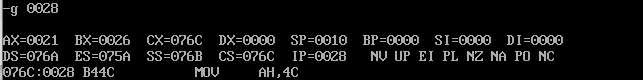 可看出ax的值是0021,是指令pop ax的偏移地址;bx的值是0026,是指令pop bx的偏移地址;cx的值是076c,是当前代码的段地址。与分析结果一致。