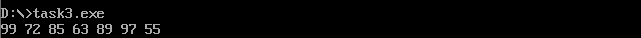 assume cs:code,ds:data data segment x db 99, 72, 85, 63, 89, 97, 55 len equ $ - x data ends code segment start: mov ax,data mov ds,ax mov si,offset x mov cx,len s: mov al,[si] mov ah,0 call printNumber call printSpace inc si loop s mov ah,4ch int 21h printNumber: mov bl,10 div bl mov dl,al mov bh,ah add dl,30h mov ah,2 int 21h mov dl,bh add dl,30h mov ah,2 int 21h ret printSpace: mov dl,20h mov ah,2 int 21h ret code ends end start