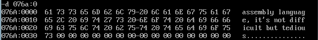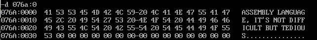 assume cs:code,ds:data data segment str db "assembly language, it's not difficult but tedious" len equ $ - str data ends code segment start: mov ax,data mov ds,ax mov si,0 mov cx,len mov ah,2 call strupr mov ah,4ch int 21h strupr: mov dl,[si] cmp dl,97 jb save cmp dl,122 ja save and dl,0dfh jmp save save: mov [si],dl inc si loop strupr ret code ends end start
