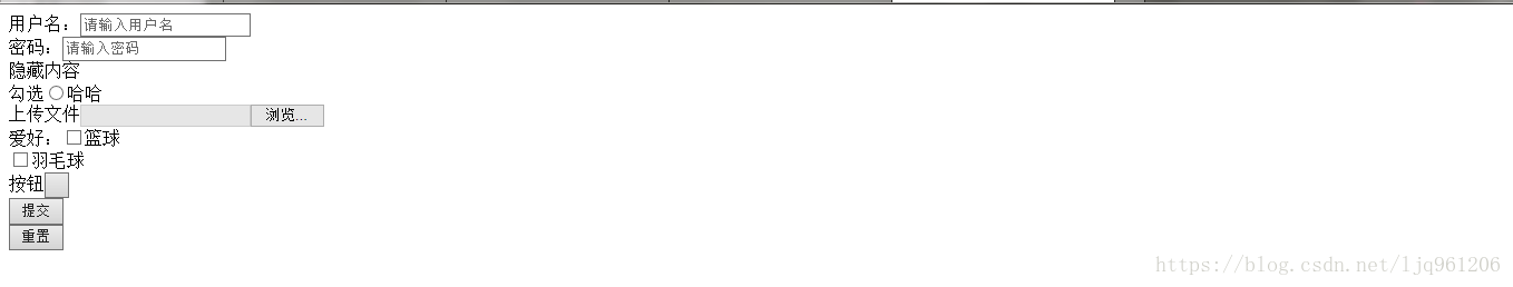 <!DOCTYPE html> <html> <head> <title>表单标签</title> <meta charset="utf-8"> </head> <body> <form action=".//列表标签/success.html" method="get"> 用户名:<input type="text" name="user" value="" placeholder="请输入用户名"><br> 密码:<input type="password" name="password" value="" placeholder="请输入密码"><br> 隐藏内容<input type="hidden" name="隐藏内容" value="hidden" placeholder=""><br> <!-- 单选 --> 勾选<input type="radio" name="勾选框" value="" placeholder=""><br>哈哈 上传文件<input type="file" name="filepload" value="" placeholder=""><br> <!-- 多选 --> 爱好:<input type="checkbox" name="复选框" value="1" placeholder="">篮球<br> <input type="checkbox" name="复选框" value="2" placeholder="">羽毛球<br> 按钮<input type="button" name="button_1" value="" placeholder=""><br> <input type="submit" name="" value="提交" placeholder=""><br> <input type="reset" name="重置" value="重置" placeholder=""><br> </form> </body> </html>