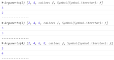 fn(2,4); fn(2,4,6); fn(2,4,6,8); function fn(a,b,c) { console.log(arguments); console.log(fn.length); //获取形参的个数 console.log(arguments.length); //获取实参的个数 console.log("----------------"); }