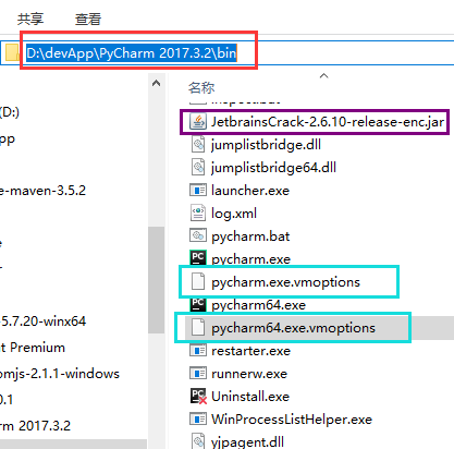 step2:下载完毕后, 将其放入pycharm在你本地的安装目录bin下。并且修改两个以 vmoptions为结尾的启动文件如图所示: