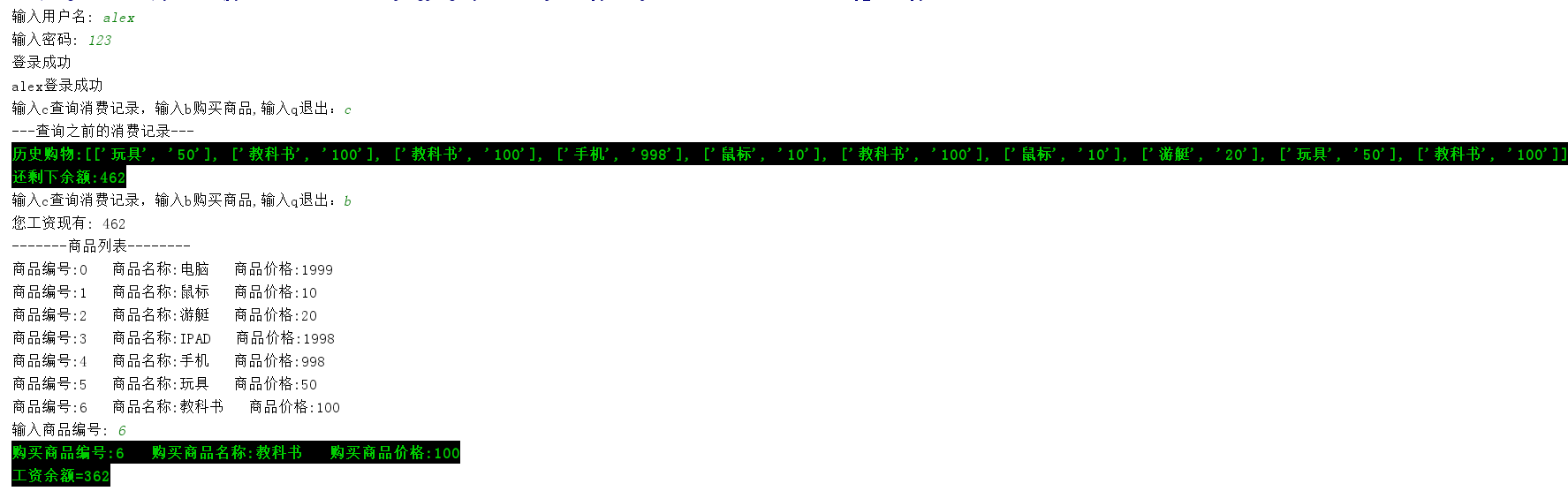 """ 购物车程序 数据结构: goods = [ {"name": "电脑", "price": 1999}, {"name": "鼠标", "price": 10}, {"name": "游艇", "price": 20}, {"name": "美女", "price": 998}, ...... ] 功能要求: 基础要求: 1、启动程序后,输入用户名密码后,让用户输入工资,然后打印商品列表 2、允许用户根据商品编号购买商品 3、用户选择商品后,检测余额是否够,够就直接扣款,不够就提醒 4、可随时退出,退出时,打印已购买商品和余额 5、在用户使用过程中, 关键输出,如余额,商品已加入购物车等消息,需高亮显示 扩展需求: 1、用户下一次登录后,输入用户名密码,直接回到上次的状态,即上次消费的余额什么的还是那些,再次登录可继续购买 2、允许查询之前的消费记录 """ import os # 商品列表 goods = [ {"name": "电脑", "price": 1999}, {"name": "鼠标", "price": 10}, {"name": "游艇", "price": 20}, {"name": "IPAD", "price": 1998}, {"name": "手机", "price": 998}, {"name": "玩具", "price": 50}, {"name": "教科书", "price": 100} ] last_shop = [] # 上次购买数据 last_bal = [] # 得到每次购买余额 def is_shop(user): """ 判断该用户是否已消费数据 :param user: :return: """ flg = False if os.path.exists(r"user_shop.txt"): # 查询用户有购买记录 with open(r"user_shop.txt", "r", encoding='utf-8') as f: for line in f: if line.find(user) != -1: flg = True break else: # 创建空文件 with open(r"user_shop.txt", "w", encoding='utf-8') as f: f.write("") return flg def login(): """ 用户登录 :return: """ err_cnt = 0 suc_user = '' # 返回成功登录用户 # 判断锁标志 while err_cnt < 3: user = input('输入用户名: ') pwd = input('输入密码: ') if user == 'alex' and pwd == '123': print('登录成功') suc_user = user break else: print('登录失败') err_cnt += 1 else: print('您登录失败已超过3次') return suc_user def check_salary(): """ 检查收入 :return: """ while True: salary = input('输入工资: ') if salary.isdigit(): break else: print('工资输入错误,请重新输入!') return int(salary) def shop(user, salary): """ 用户购物 """ shop_cart = [] # 购物车 while True: print('-------商品列表--------') for index, value in enumerate(goods): print('商品编号:%s 商品名称:%s 商品价格:%s' % (index, value['name'], value['price'])) choice = input('输入商品编号:---输入q退出购买 ') if choice.isdigit(): choice = int(choice) if 0 <= choice < len(goods): price = goods[choice]['price'] if (salary - price) > 0: salary = salary - price shop_cart.append(goods[choice]) print('\033[1;32;40m购买商品编号:%s 购买商品名称:%s 购买商品价格:%s\033[0m' % (choice, goods[choice]['name'], goods[choice]['price'])) print('\033[1;32;40m工资余额=%s\033[0m' % salary) else: print('余额不足') continue else: print('商品编号不存在!') elif choice == 'q': print('\033[1;31;40m-------本次购物退出--------\033[0m') if len(shop_cart) > 0: print('-------本次购买商品列表--------') with open(r"user_shop.txt", "a+", encoding='utf-8') as f: f.write("user:%s\n" % user) for value in shop_cart: shop_info = '购买商品名称:%s|购买商品价格:%s' % (value['name'], value['price']) print('\033[1;32;40m%s\033[0m' % shop_info) f.write(shop_info + "\n") bal_info = '工资余额:%s' % salary print('\033[1;32;40m%s\033[0m'% bal_info) f.write(bal_info + "\n") break def get_shop(user): """ 读取文件得到用户已消费数据 :param user: :return: """ flg = False resume_goods = [] # 消费商品 with open(r"user_shop.txt", "r", encoding='utf-8') as f: for line in f: if line.find("购买") != -1: shop_li = line.split("|") resume_goods.append([shop_li[0].split(":")[1].strip(), shop_li[1].split(":")[1].strip()]) elif line.find("余额") != -1: last_bal.append(line.split(":")[1].strip()) print("\033[1;32;40m历史购物:%s\033[0m" % resume_goods) # 带绿色输出 print('\033[1;32;40m还剩下余额:%s\033[0m' % last_bal[-1]) # 带绿色输出 if __name__ == '__main__': user = login() if user != '': print('{}登录成功'.format(user)) while True: action = input('输入c查询消费记录,输入b购买商品,输入q退出:') if action == 'q': print('\033[1;31;40m---退出程序------\033[0m') # 带红色输出 get_shop(user) break elif action == 'c': if is_shop(user): print("---查询之前的消费记录---") get_shop(user) else: print("---查询之前无消费记录---") elif action == 'b': if not is_shop(user): salary = check_salary() else: salary = int(last_bal[-1]) print('您工资现有:', salary) shop(user, salary)