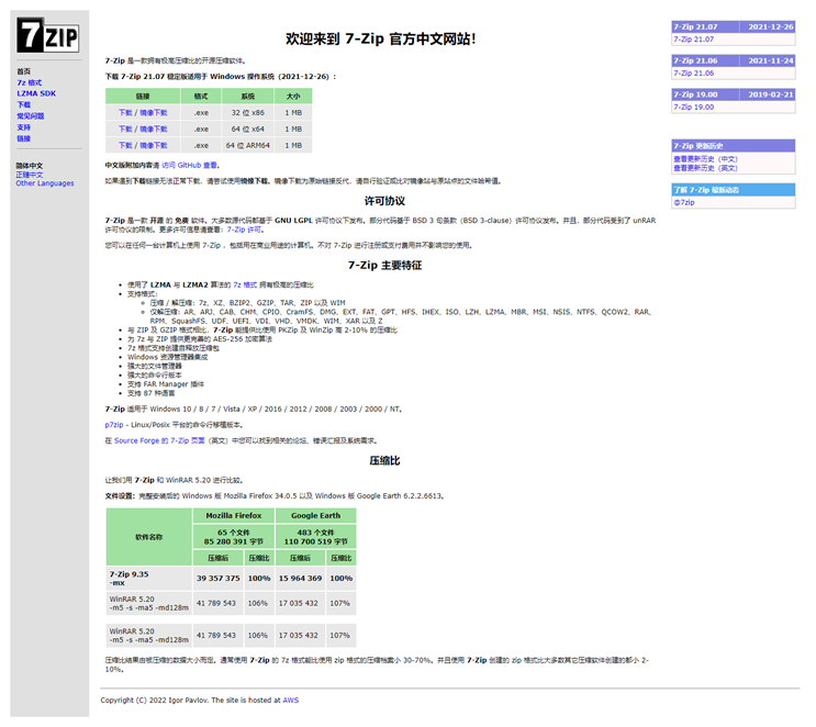 7z 不仅仅支持 7z和zip格式的压缩与解压,也支持rar 格式的解压 ,并且可以解压 ISO 光盘镜像等,日常办公使用足够了,软件免费开源无广告,网站截图如下: