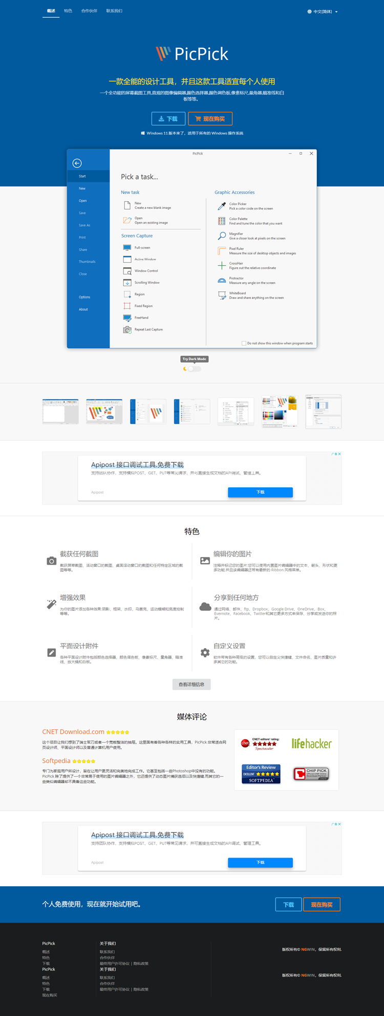- 截图工具,PicPick,开源免费,无广告,支持图片的编辑裁剪、添加文字箭头等等基础编辑功能PicPick