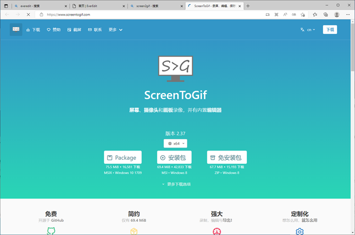 - 录屏工具 screen2gif,开源,免费,无广告。ScreenToGif 网站截图如下: