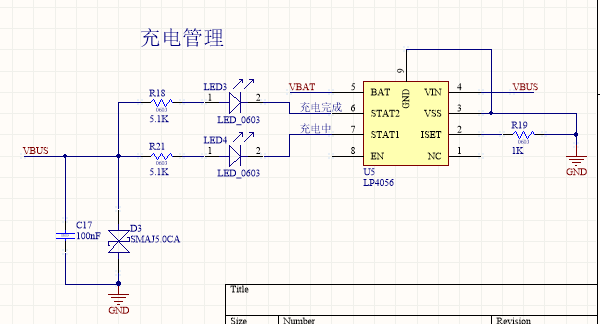 充电管理使用LP4056芯片,通过R19控制充电电流,此处设置充电电流1A,I充电=1000/R19
