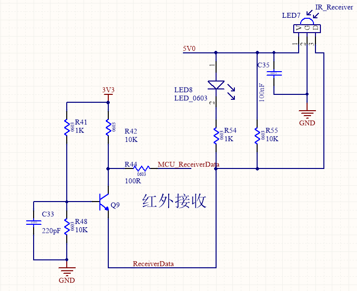 接收电路通过3号引脚输出信号,R55对输出信号提供上拉,使红外在未接收到信号时为高电平,接收到信号时为低电平,ReceiverData另外通过电平转换电路,将5V信号转换为3.3V信号输入至MCU