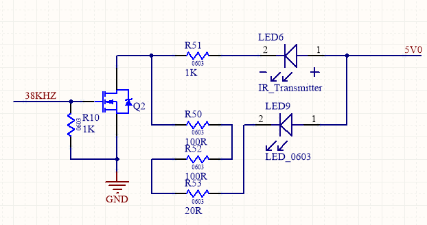 通过NMOS控制发射LED接地端的连接控制红外LED以38KHZ的频率点亮或关闭熄灭,进而发送红外信号。