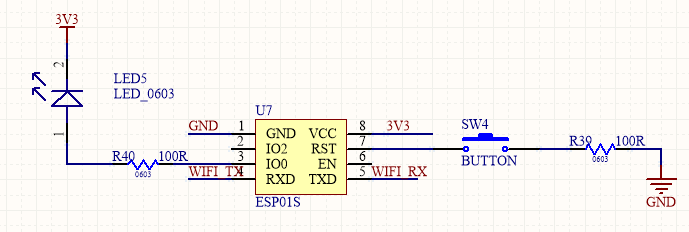 ESP01S的串口与单片机USART3连接,用以与MCU交换数据,SW4为ESP01S的复位键,LED用以指示WIFI工作状态。